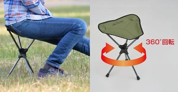 展開時はよくある3脚タイプのチェアですが、このチェアは360°回転可能な3脚チェアとなっているので座った状態での利便性は高い!「背もたれ/ひじ掛け」が付いているチェアはリラックス性の観点からかなり良い製品だが、それでも360°回転する事は出来ない。